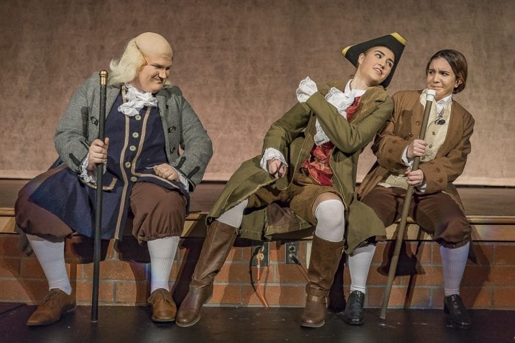 Those who have seen productions of the musical, or perhaps the 1972 movie, know going in that Benjamin Franklin provides most of the humor. Jordyn Fields has a great time on stage doing just that as Dr. Franklin.