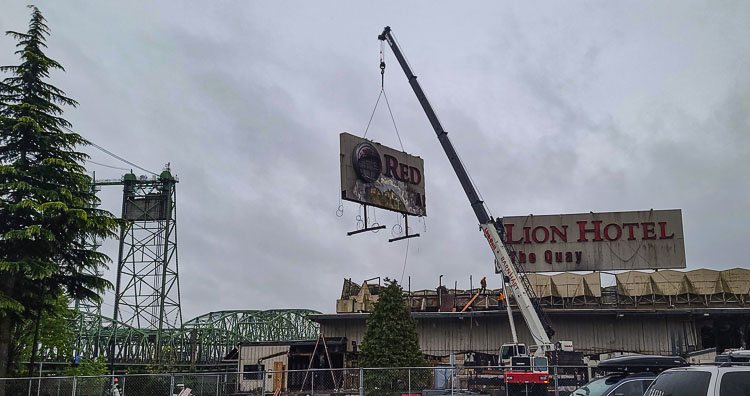 Crews, using a crane, took down the large Red Lion Hotel at the Quay sign on Thursday, part of the Port of Vancouver’s continuing development of Terminal 1.