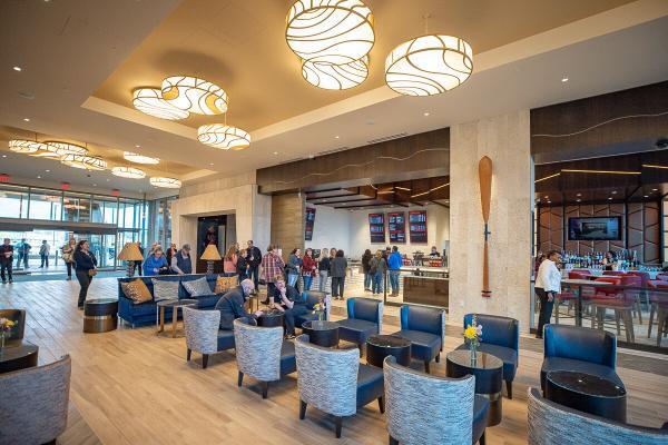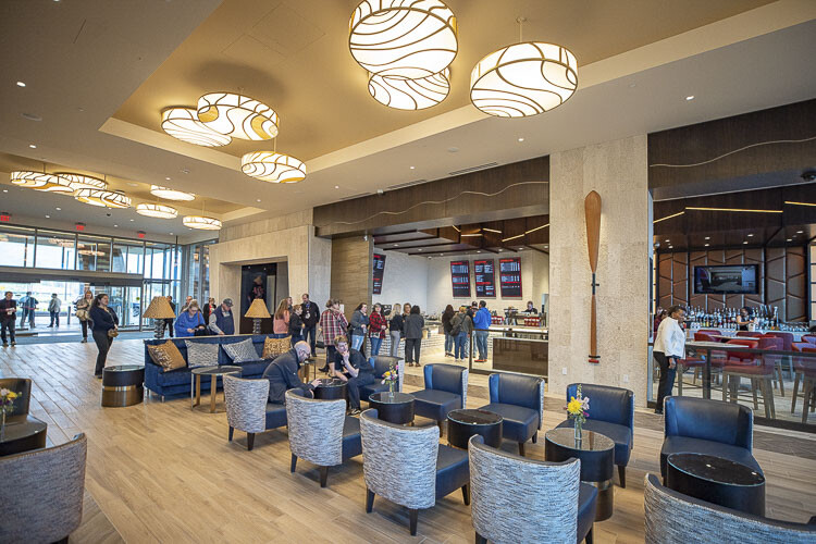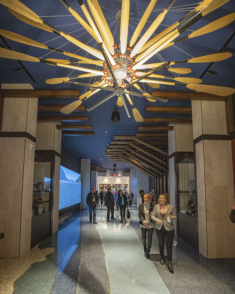 An impressive central light fixture illuminates the hallway, featuring an array of hand-carved Cowlitz tribal artisan canoe paddles commissioned specifically for the corridor. The walls of the corridor also boast seamless video displays that immerse guests in high-resolution footage from the Cowlitz Indian Tribe’s historical homelands and teachings of the Tribe’s history.