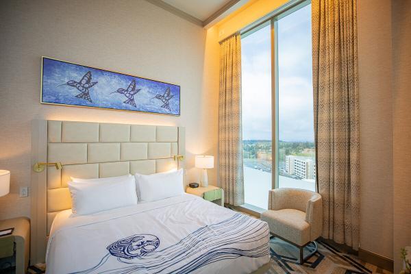 At ground level, a fully equipped fitness center keeps guests on track with their exercise routines while relaxation takes center stage at the state-of-the-art indoor-outdoor pool experience. The pool area features a craft bar, an exclusive dining menu, private and fully serviced cabanas, and comfortable daybeds, among other perks. The Lobby Cafe offers coffee, blended drinks, snack, breakfast and lunch with drinks from locally made Red Leaf Organic Coffee, while the Lobby Bar & Bistro offers expertly crafted cocktails in a relaxed environment. The property’s in-house bakery furnishes scratch-made pastries for its dining areas and room service. Additionally, the hotel’s staffed concierge is available 24/7 to guide visitors to the can’t-miss property and area attractions.