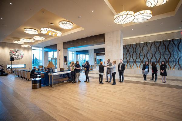 Design details sprinkled throughout the glass hotel tower pay homage to the heritage of the Cowlitz Indian Tribe. For instance, the Cowlitz Cultural Corridor connects the new ilani Hotel tower to the existing casino resort with an immersive experience that preserves and celebrates the cultural heritage and aboriginal lands of the Cowlitz Indian Tribe.