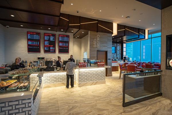 At ground level, a fully equipped fitness center keeps guests on track with their exercise routines while relaxation takes center stage at the state-of-the-art indoor-outdoor pool experience. The pool area features a craft bar, an exclusive dining menu, private and fully serviced cabanas, and comfortable daybeds, among other perks. The Lobby Cafe offers coffee, blended drinks, snack, breakfast and lunch with drinks from locally made Red Leaf Organic Coffee, while the Lobby Bar & Bistro offers expertly crafted cocktails in a relaxed environment. The propertyโs in-house bakery furnishes scratch-made pastries for its dining areas and room service. Additionally, the hotelโs staffed concierge is available 24/7 to guide visitors to the can’t-miss property and area attractions.