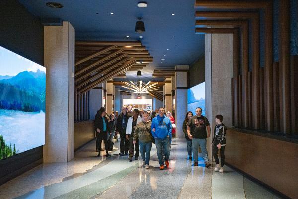 An impressive central light fixture illuminates the hallway, featuring an array of hand-carved Cowlitz tribal artisan canoe paddles commissioned specifically for the corridor. The walls of the corridor also boast seamless video displays that immerse guests in high-resolution footage from the Cowlitz Indian Tribeโs historical homelands and teachings of the Tribe’s history.