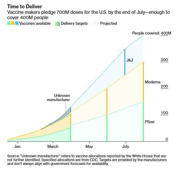Bloomberg reports that the U.S. leads the world in total vaccines administered. Drugmakers have promised to deliver enough shots to fully vaccinate 130 million Americans by the end of March and 300 million people by the end of May. That would be more than enough for every adult. Clinical studies in children are presently underway.