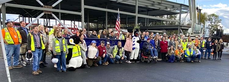 During the ceremony, nearly 100 attendees including the college mascot, Oswald the Penguin, watched as a blue-painted steel beam decorated with the U.S. flag and an evergreen tree symbolizing persistence, prosperity and longevity, were positioned at the structure’s pinnacle.