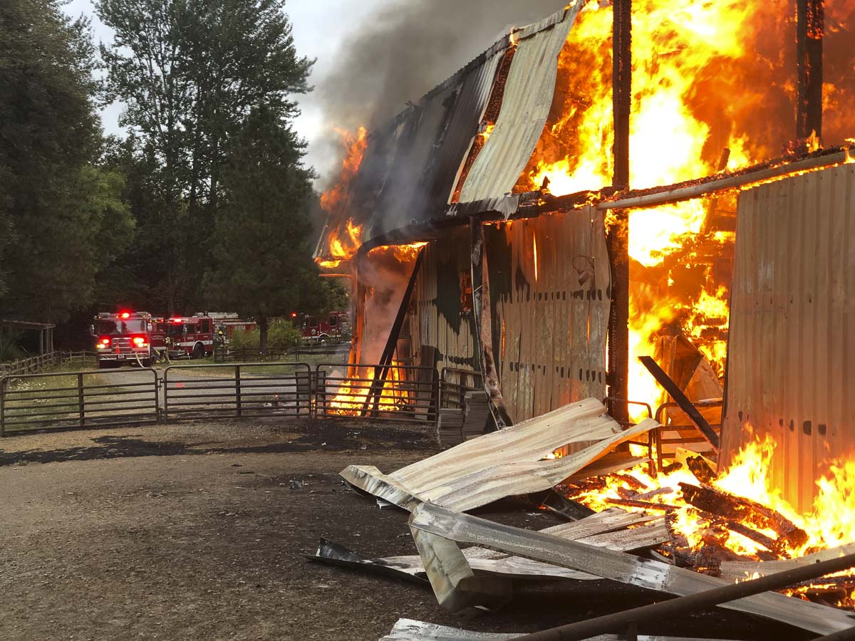 Clark County Fire & Rescue (CCFR) crews were dispatched at 6:56 a.m. Monday (Aug. 31) to a report of a barn on fire at 2015 NE 209 Street in the Duluth area. CCFR Engine 26 from the Dollar’s Corner station arrived at 7:02 a.m. to find a two-story barn/shop fully involved in fire. Due to the large volume of fire, crews made the initial fire attack from outside of the structure.