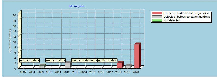 Between April and October 2020, Lacamas Lake was tested 29 times, 26 of which detected cyanotoxins, according to concerned citizen Marie Callerame. There were 14 weeks when toxin levels were “above state guidelines” for microcystin. The Anatoxin-A neurotoxin was found nine times and above the state guideline once. The county removed it’s most recent “warning” on Lacamas Lake Dec. 7 and their “caution” on Round and Hidden Leaf lakes Nov 24.