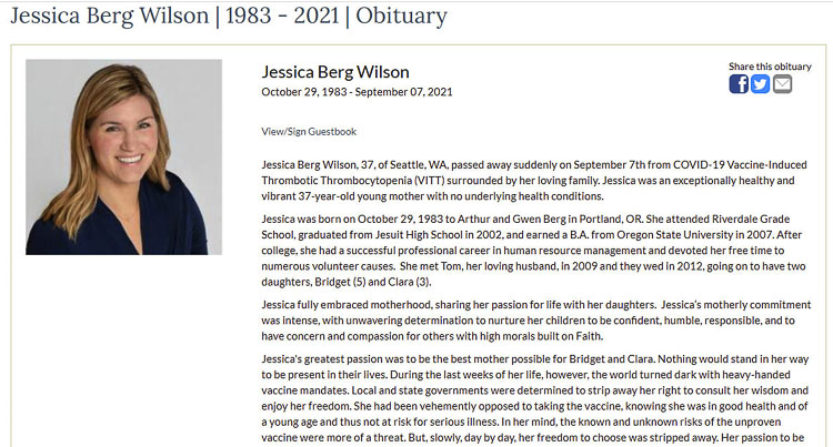 In the past few months, a couple of concerning stories have emerged. Young, healthy people have suddenly died. Sarah Ann Mikesell, a 36-year-old graduate of Woodinville High School died suddenly at her apartment in Seattle according to an obituary. Jessica Berg Wilson died at age 37 last September. Clark County Today also reported on a 17-year-old female who died from a heart attack, one of three deaths in the state attributed to the vaccine.
