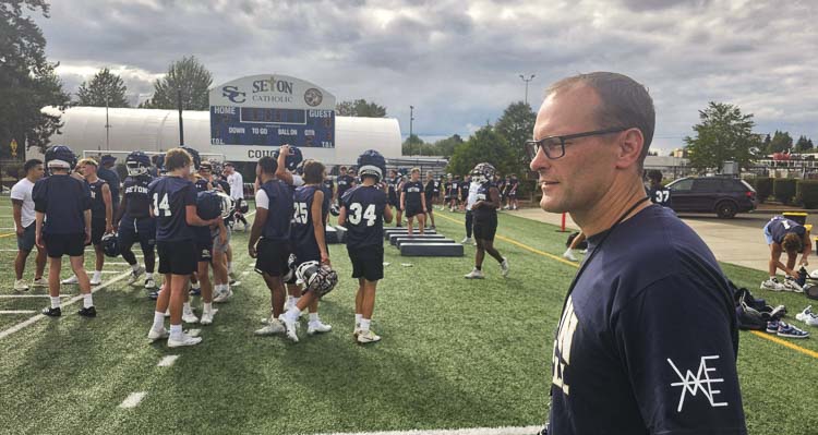 Starting the school year on Aug. 21 also brought another first to Seton Catholic. This year, Aug. 21 was the first day of football practice in the state, too.
