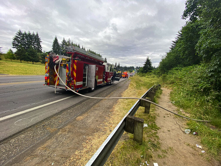 Firefighters from Clark County Fire District 6 battled a stubborn fire Tuesday that started in a large houseless encampment between Highway 99 and Interstate 5, west of the Bonneville Power Administration Ross Complex.