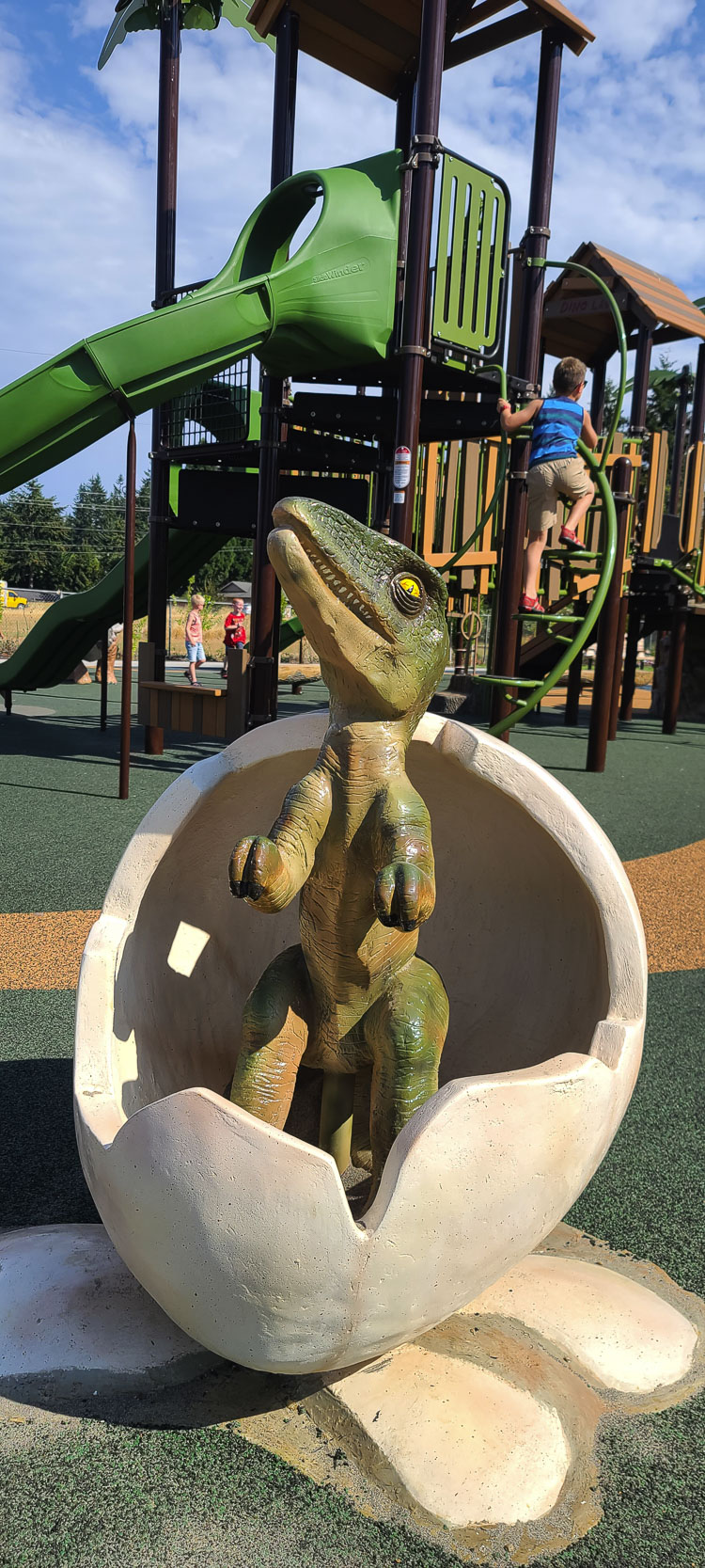 The park has a modern play structure with a prehistoric theme. Children can make friends with dinosaurs or dig for fossils.