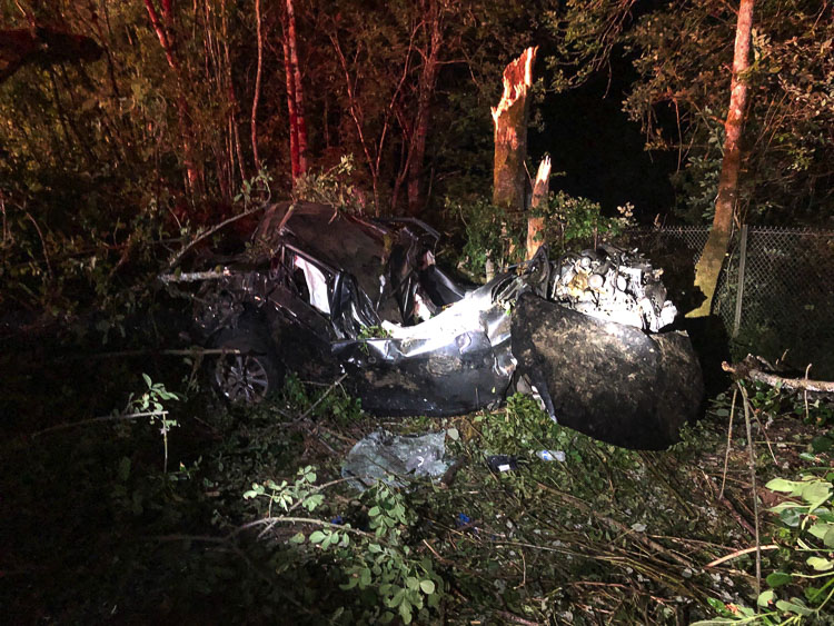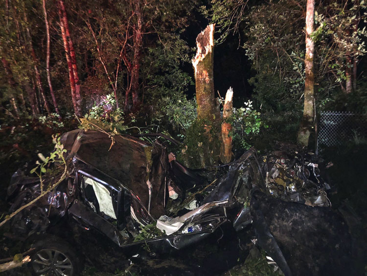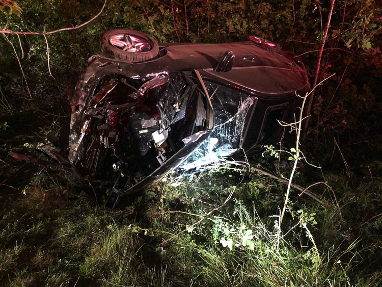 The second vehicle left the roadway, rolled then struck a tree which caved in the roof of the SUV. It came to rest on its tires. The trunk of the tree broke off eight-to-ten feet above the ground and came to rest on top of the vehicle. The driver was conscious and trapped inside.