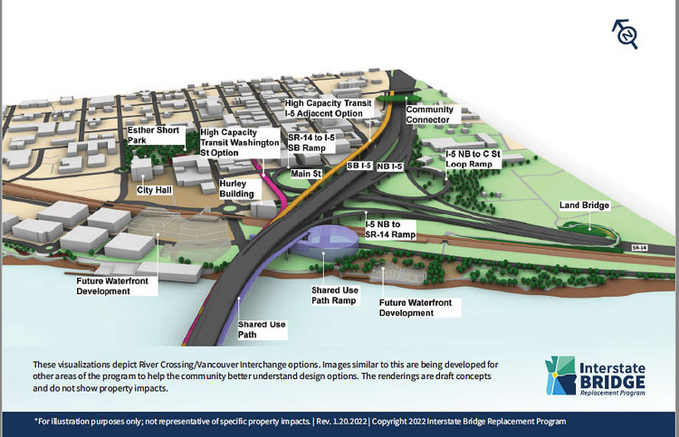 Vancouver Mayor Anne McEnerny-Ogle asked if they had any graphics to show the impact of the design options where the bridge lands in Vancouver. The city continues to work on the waterfront expansion.