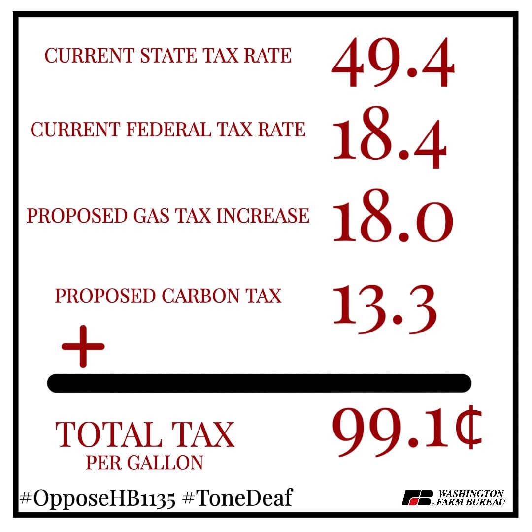 The Washington Farm Bureau came out in opposition to the bill. “Can you afford to spend $1.00 per gallon in TAXES at the pump? House Democrats have proposed a $26 Billion transportation package that includes 28 individual fees! This will be detrimental to agriculture, leaving farmers pockets empty and their communities hungry. Please explain to us how this is a #OneWashington approach? It’s not.”