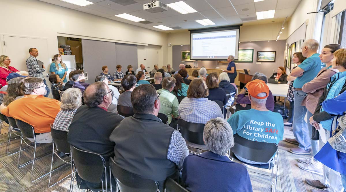 At least 50 people crowded into a room at the Battle Ground Community Library on Monday evening, spilling out into the hallway, in an attempt to urge the Board of Trustees and Executive Director Amelia Shelley to cancel Drag Queen Story Hour.