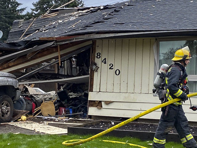 The first units to arrive found a single-story house with significant structural damage to the garage. No active fire was found. A witness said an accidental discharge of a firework might have occurred in the garage.
