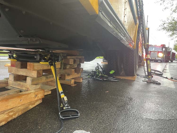 Fire crews on scene used wooden blocks to support the bus while lifting it off the child using struts that extend hydraulically. The child was removed from under the bus and transported emergently to a Portland-area pediatric hospital with non-life-threatening injuries.