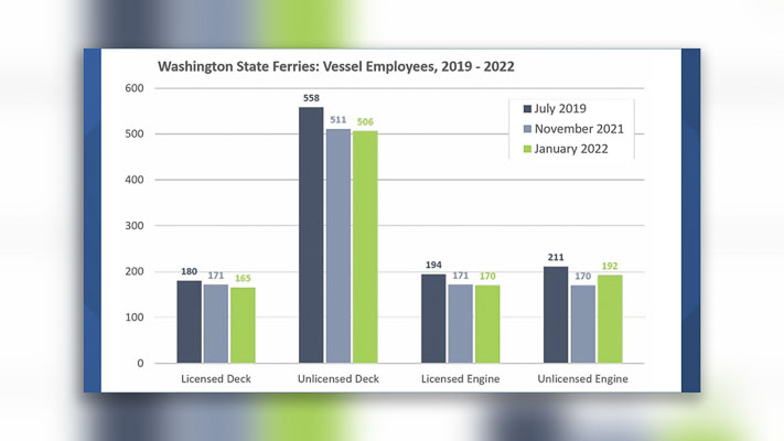 While the alert says WSF faces “crewing shortages due to a global shortage of mariners that has been worsened by the pandemic,” a WSF employment chart (pictured above) indicates the governor’s COVID-19 vaccine mandate on state employees gets much of the blame. Ian Sterling, ferry spokesman, also told KING 5 News that the vaccine-or-lose-work mandate was an issue in retaining crew members.