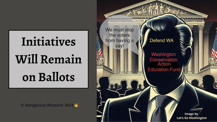 It’s as if Ferguson and Hobbs were conspiring with the plaintiffs to disenfranchise the millions of voters who participated in the initiative process. It’s a disgrace. If Bob Ferguson won’t properly defend the rights of the voters, is he the right person to become Washington’s next governor? Should Steve Hobbs remain as the Secretary of State? I think not.