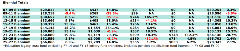 - “Total state revenues are expected to grow 20.7% between the 2019-21 and 2021-23 biennia and 2.4% between the 2021-23 and 2023-25 biennia”