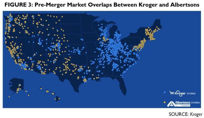 In fact, a review of all of the Albertsons and Kroger locations throughout the country shows very few places where the two stores both have locations.
