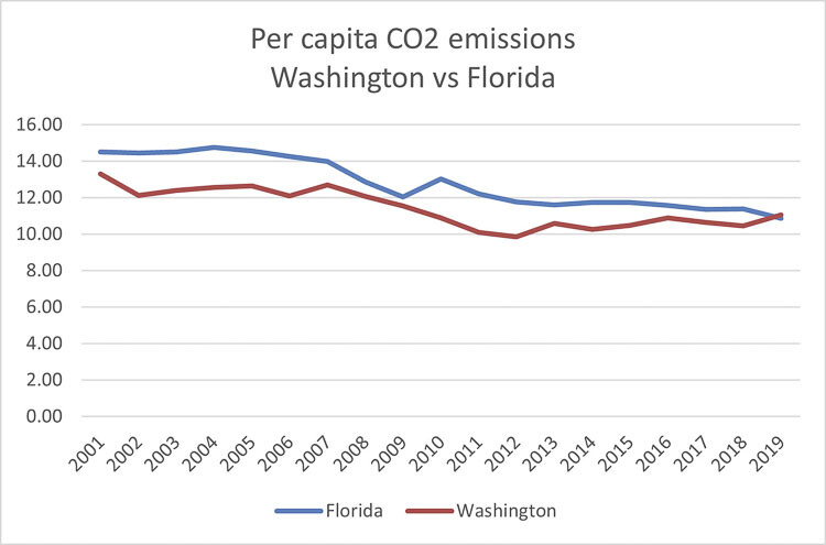 One notable example is Florida. Over the last 20 years, Florida’s per capita CO2 emissions have declined by more than 25 percent. For 2019, per capita emissions in Florida are actually lower than Washington’s.