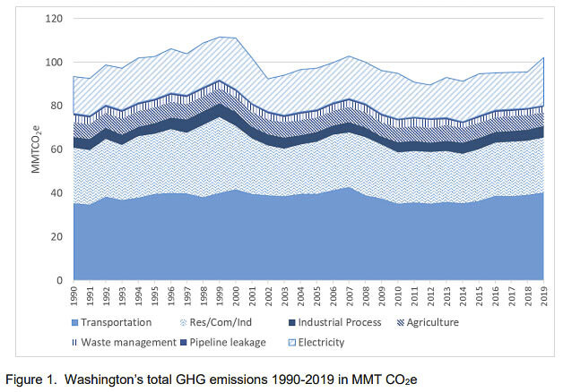 The Washington State Department of Ecology released statewide CO2 emissions for 2019, showing an increase of about seven percent from 2018. Since 2012, Washington’s CO2 emissions have increased almost every year and total emissions increased about ten percent to 102.1 million metric tons (MMT).