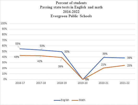 At the same time Evergreen students are being shorted on their education. The district failed to educate 75% of students adequately in math and 61% adequately in English. Here are the academic test results.