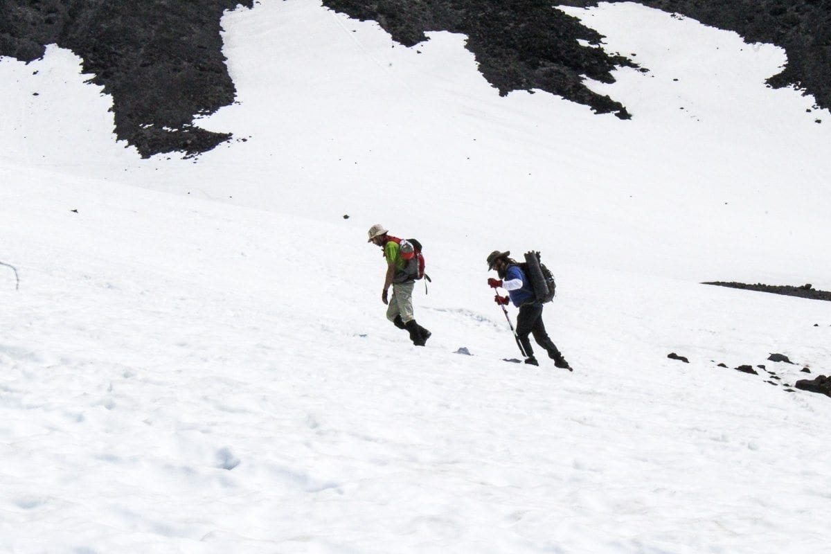 She was glissading down the southern flank after successfully reaching the summit, one of the many aspects and activities on the mountain I was unaware of and thus unprepared for. Glissading is the act of sliding down established chutes in the snow, whether seated on a trash bag or some other slick means of conveyance, and zooming down the mountainside like a backwoods bobsledder.