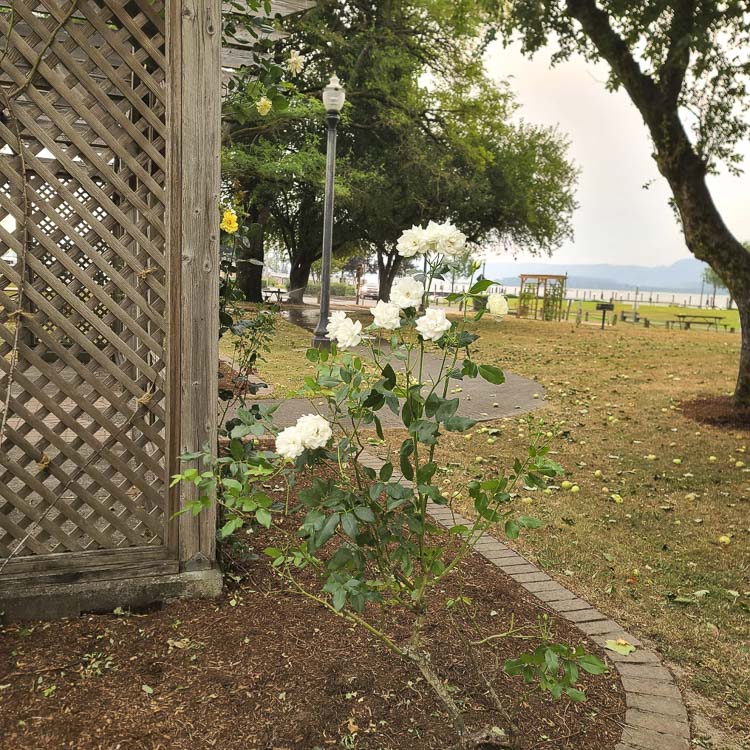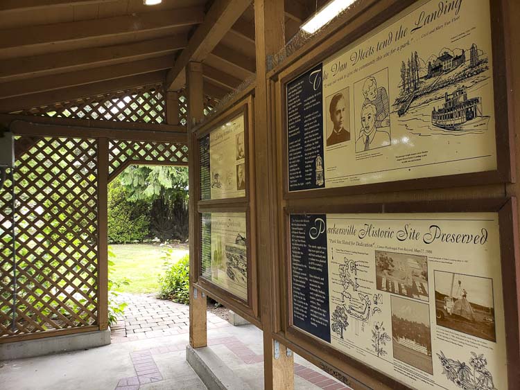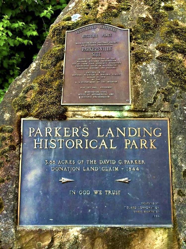The beautiful park with its rose arbor, large historic trees, colorful flowers, and spectacular views of the Columbia River and Mt. Hood, holds significant local history. It is the site of Parkersville, a town platted on May 1, 1854. As a result of citizen activism and organization, the town site was added to the National Register of Historic and Archeological Places on August 11, 1976, by the U.S. Department of the Interior with support from the Washington State Office of Archaeology and Historic Preservation. Artifacts recovered from the park site represented the presence of Indigenous tribes for thousands of years before settlers crossed the Oregon Trail.