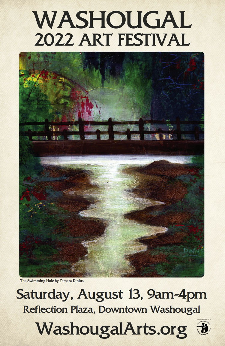 Local multimedia artist Tamara Dinius’ piece, The Swimming Hole, has been selected as the featured artwork for the 2022 Washougal Art Festival promotional materials. The festival will be held on Sat., Aug. 13 at Reflection Plaza in downtown Washougal.