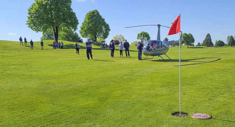 Helicopter lands, takes flight again, and drops golf balls at Tri-Mountain Golf Course in fundraiser for the La Center community