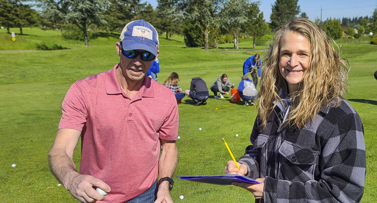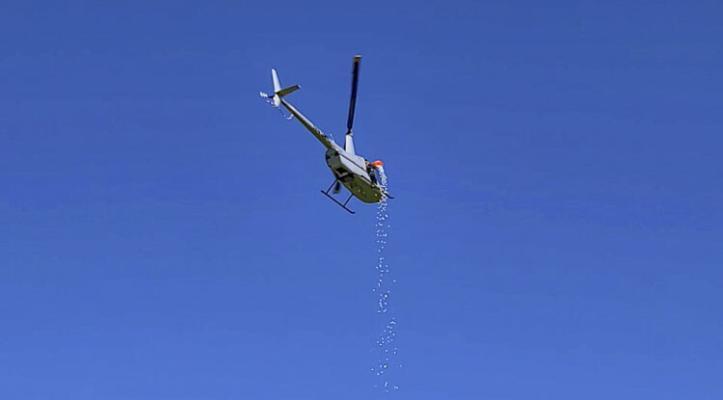 Pilot Darin Graybill of Raven Aircraft, based out of Camas, along with co-pilot Jantzen Filbrun were the centers of attention when they landed on the 18th fairway. They shut down the engine, then loaded up the bucket of golf balls. Filbrun transitioned from co-pilot to ball-dropper when Graybill lifted off with the payload.