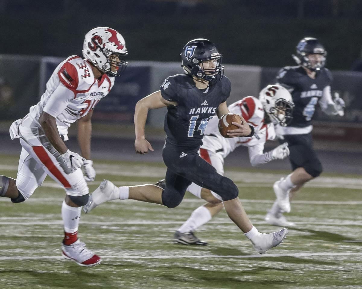 “In the fourth quarter, we played not to lose instead of to win,” said Sawyer Racanelli, who rushed for two TDs and caught a TD pass for the Hawks. “We’ll have to work on that this next week. I’m pleased with the win, but we have a lot of work to do.”
