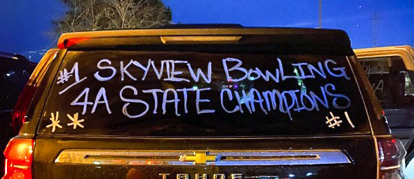 In fact, unbeknownst to the bowlers, some of the Skyview parents went out to the parking lot to decorate the team vehicles. Using blue and white paint pens, they wrote the players’ names and displayed “State Champs” on the windows.