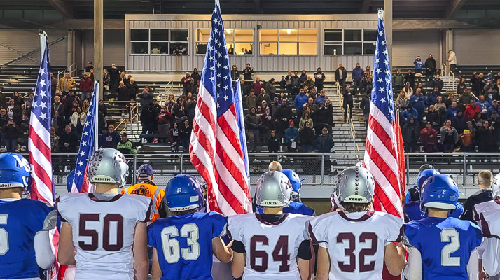 The Wildcats and Bulldogs entered the stadium at Woodland High School as one. Montesano players wearing white. La Center in blue. With some players carrying American flags, while others carrying flags representing the service branches of the U.S. military.