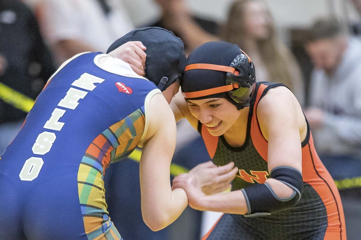 Other individual champions included Fort Vancouver’s Eliana Duff (pinned Kelso’s Mayci Bloomfeldt in 115-pound final); Eliana Sabatini, of Camas (pinned Hudson’s Bay’s Madison McMillan in 135-pound final); Hudson’s Bay’s Allison Blained (16-1 decision over Kelso’s Makeyla Roggow in 140-pound final) and La Center’s Lexi Keysar (pinned Mountain View’s Indra Gutierrez-Gaitan in 190-pound final).