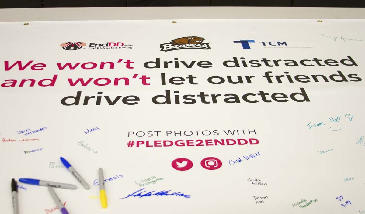 Students watched a video of a 20-year-old driver who turned to look in her backpack and drove her car into a pedestrian as he was crossing the street. Students gasped at how the driver didn’t even slow down when she hit the pedestrian. The pedestrian survived but is still recovering from a serious brain injury.