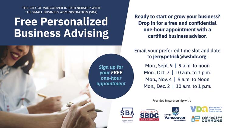 VANCOUVER – The city of Vancouver and select partner agencies are offering Vancouver business owners and aspiring entrepreneurs the opportunity to receive free and confidential business advice from a certified business advisor. The one-hour appointments will be available this fall at the following dates and locations: