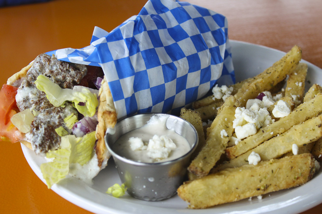 Even the fries offered as a side at George’s are given a Greek twist, seasoned with Greek herbs and spices, topped with feta cheese and served with a feta dip.