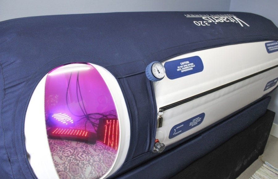 The chambers inflate to expose people to increased atmospheric pressure, helping to better oxygenate the body thus reducing inflammation and promoting healing, Huntington says. Inside, she has added LED lights, which clients can place directly over or under the areas that need more direct attention.