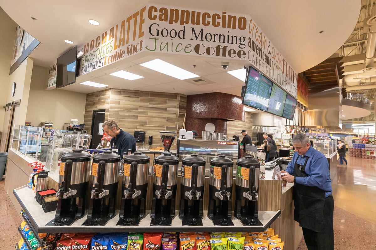 The Rosauers supermarket includes a full organic section, brick oven fired pizza, a bakery where everything is cooked fresh, a deli with actual butchers on duty, sushi, hot bar, salad bar, soup bar, and an olive bar.