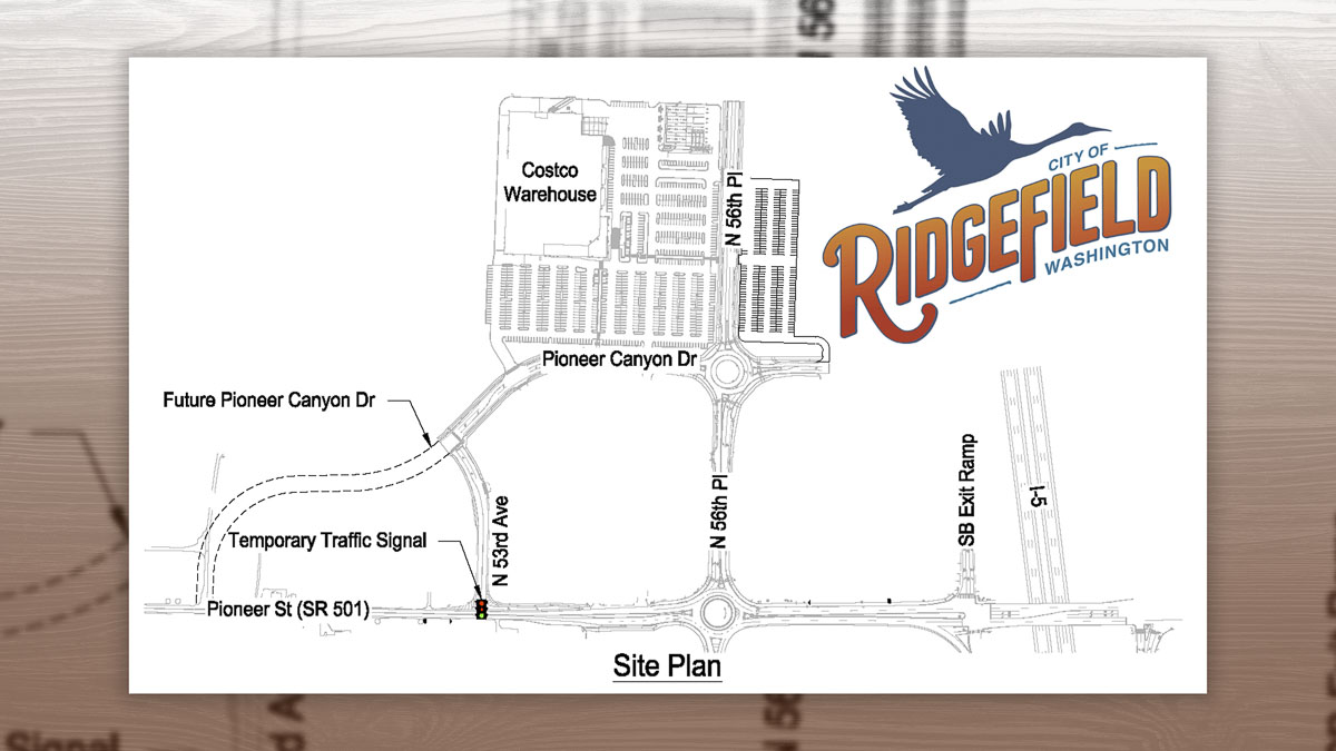 The Ridgefield Costco Warehouse plans to open on Thu., Aug. 29 at 8 a.m. Two routes will be available between Pioneer Street and Costco: one via N 56th Place and one via N 53rd Place and Pioneer Canyon Drive. A temporary traffic signal at 53rd and Pioneer will be remotely monitored to adjust for real-time conditions and ensure smooth traffic flow.