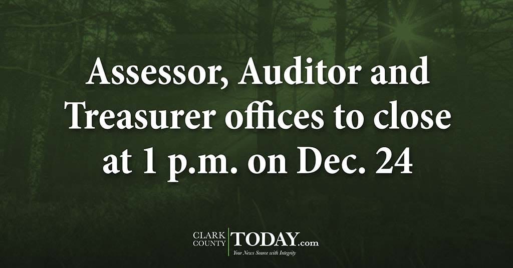 VANCOUVER – The joint lobby on the second floor of the Public Service Center, 1300 Franklin St., providing treasurer, assessor and auditor services will be closing to the public at 1 p.m. Mon., Dec. 24. Marriage license applications will not be accepted after 12:30 p.m..