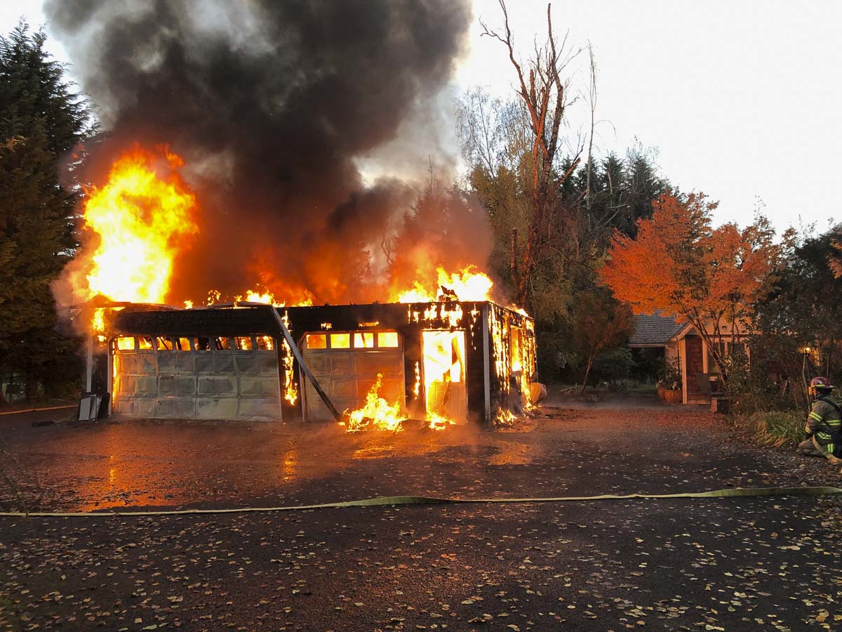 The first engine arrived at about 7:30 a.m. to find a large detached garage fully involved in flames. The garage was approximately 15 feet from the main house. Due to the volume of fire and heat, the house was at risk of catching fire also. Initial action by the first arriving crew focused on protecting the house from catching fire. Once additional crews arrived, efforts were turned toward extinguishing the garage fire.