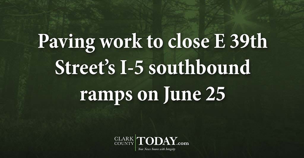 VANCOUVER — Southbound Interstate 5 on- and off-ramps at East 39th Street will be closed from 7 a.m. to 5 p.m., Tue., June 25, to allow for paving work following a city of Vancouver water main construction project. Drivers who typically use those southbound ramps to and from 39th Street, on the west side of I-5, are urged to plan ahead and take an alternate route.
