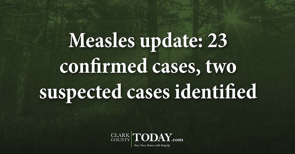 VANCOUVER — Clark County Public Health is continuing its measles outbreak investigation. Since Jan. 1, 23 confirmed cases and two suspected cases have been identified.