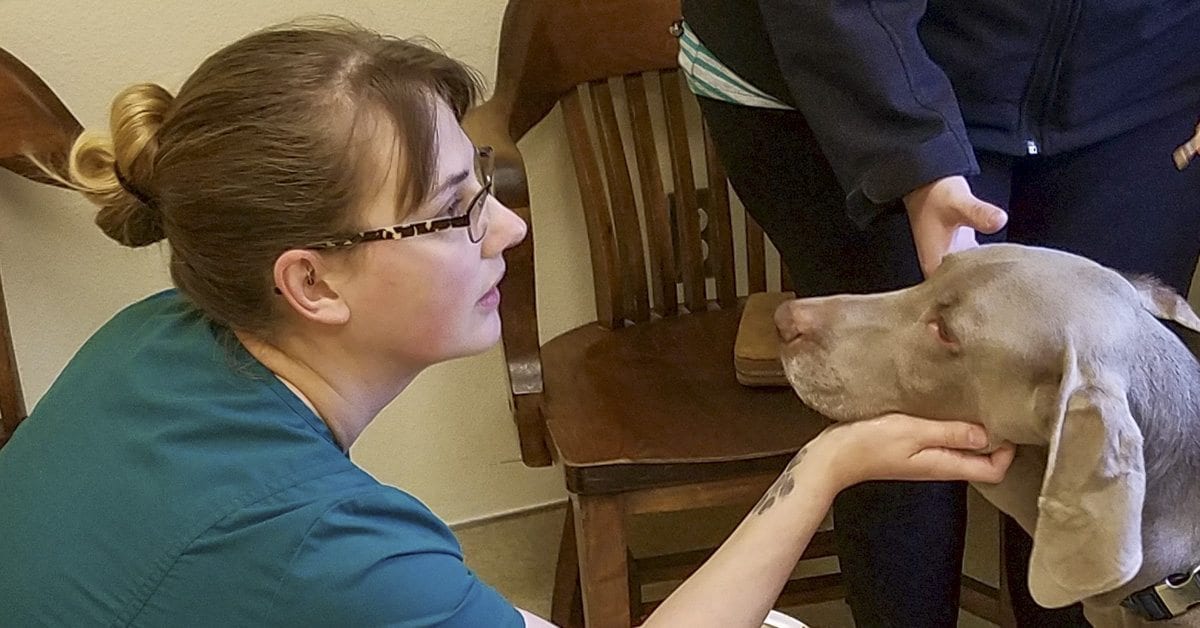 For one appointment last week, Ayers had the fun assignment of getting some peanut butter and whipped cream for Jager, a 77-pound Weimaraner. With Jager distracted by the goodies, Dr. Kristi Wubben was able to give the dog his vaccinations.