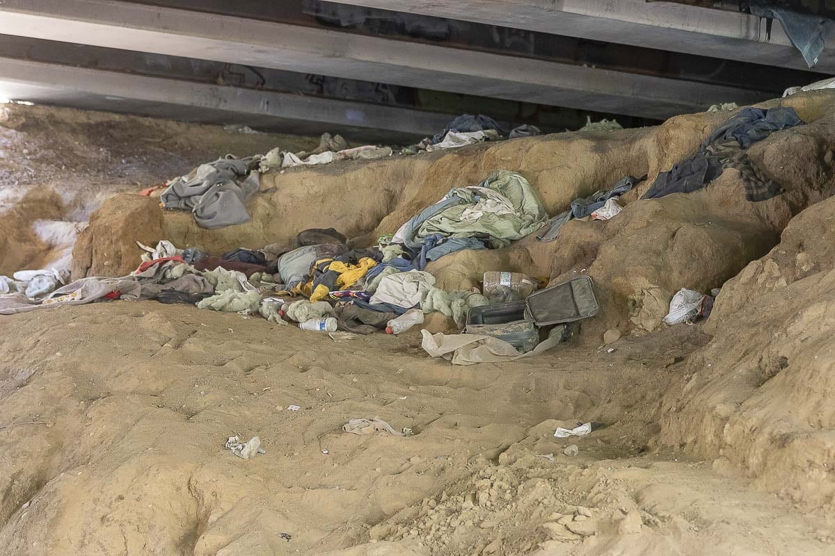 But alongside nearly every one of those signs, installed nearly two years ago, are pathways leading into the woods on either side. Following any one of them will usually lead to campsites that either appear to be active, or at least recently used. Blankets, tents, tarps, piles of trash, and even children’s toys litter many of the sites. A few sleeping people could be seen in the brush at a few of the sites.