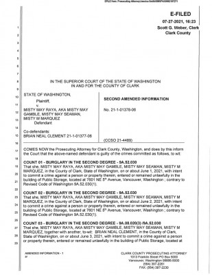 Other information provided by the Clark County Prosecutor’s Office Tuesday indicated that Misty Raya is being accused of giving Guillermo Raya Leon a change of clothing when the three were leaving The Pointe Apartments in the Toyota SUV.